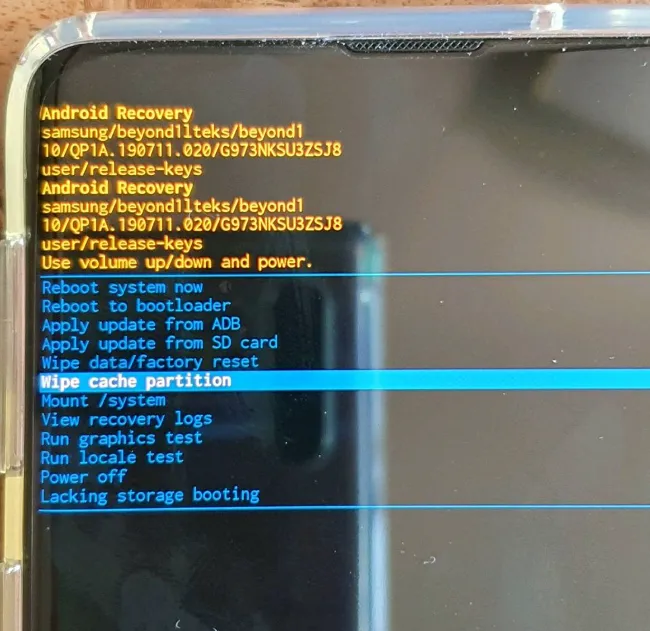 리커버리 모드 진입 후 캐시삭제 실행방법(아래순서 참조)