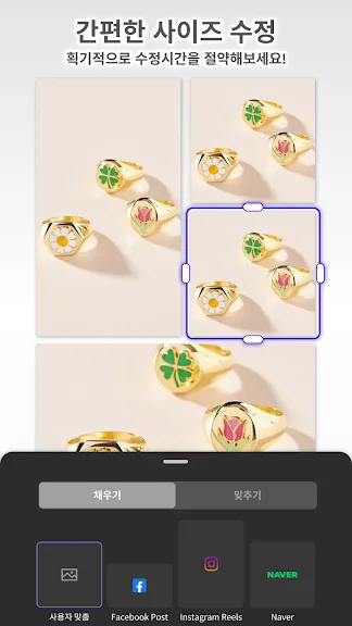 - 인스타그램, 페이스북, 유튜브, 핀터레스트와 같은 소셜 플랫폼이나 Depop, Poshmark, 아마존, Shopify와 같은 글로벌 이커머스 마켓 플레이스에 맞춰 사진 크기를 즉시 조정합니다. 수천 개의 템플릿을 사용해 프로세스를 간소화하고 제품 등록 속도를 최대 3배까지 높일 수 있습니다.