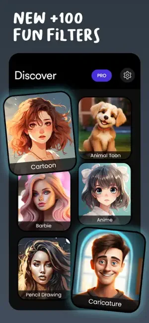 100+ 만화 필터! AI 캐리커처, 아기와 애완동물 아바타, 바비 사진, 연필 스케치로 사진을 재미있는 만화로 변환하세요.